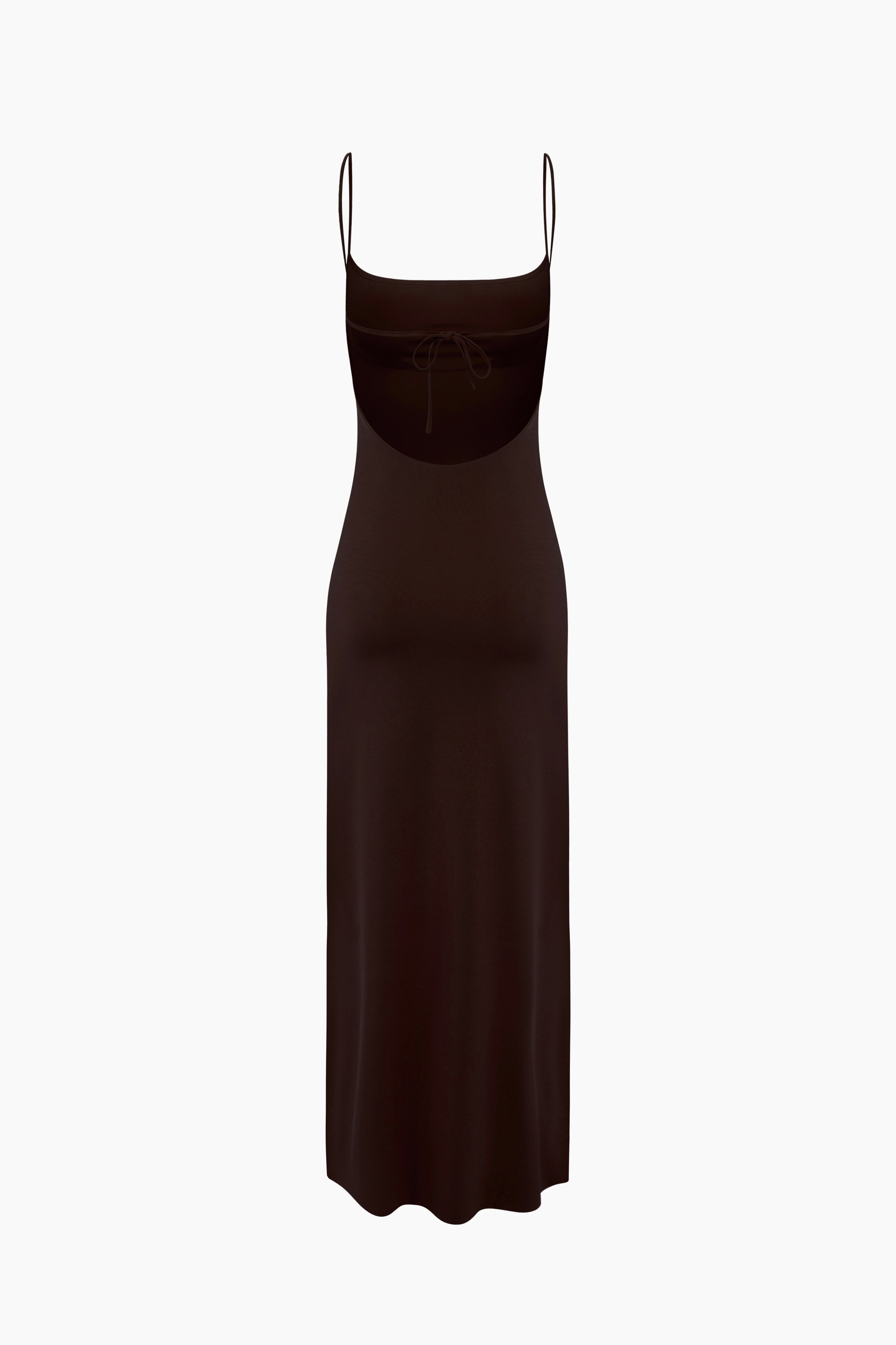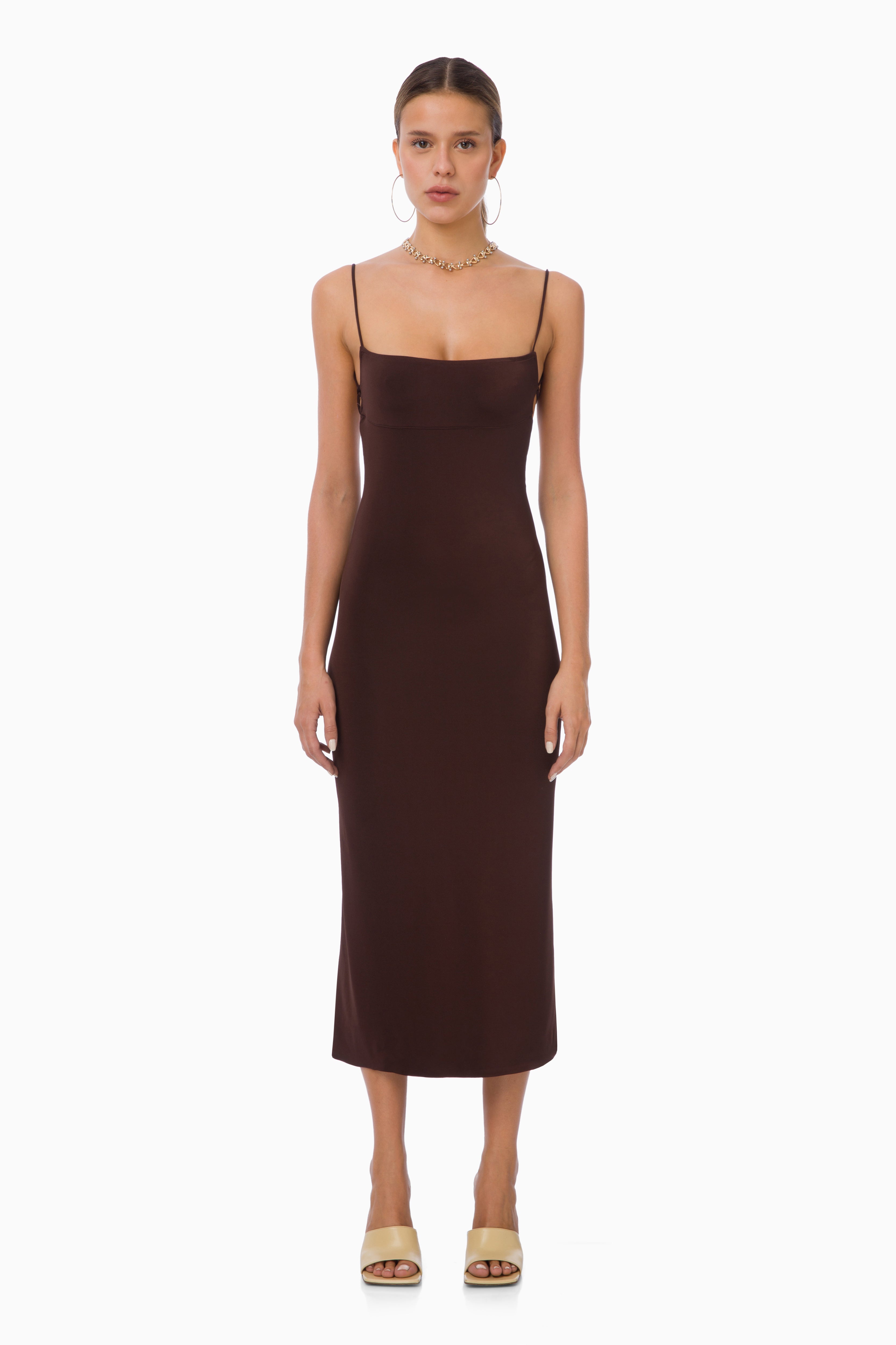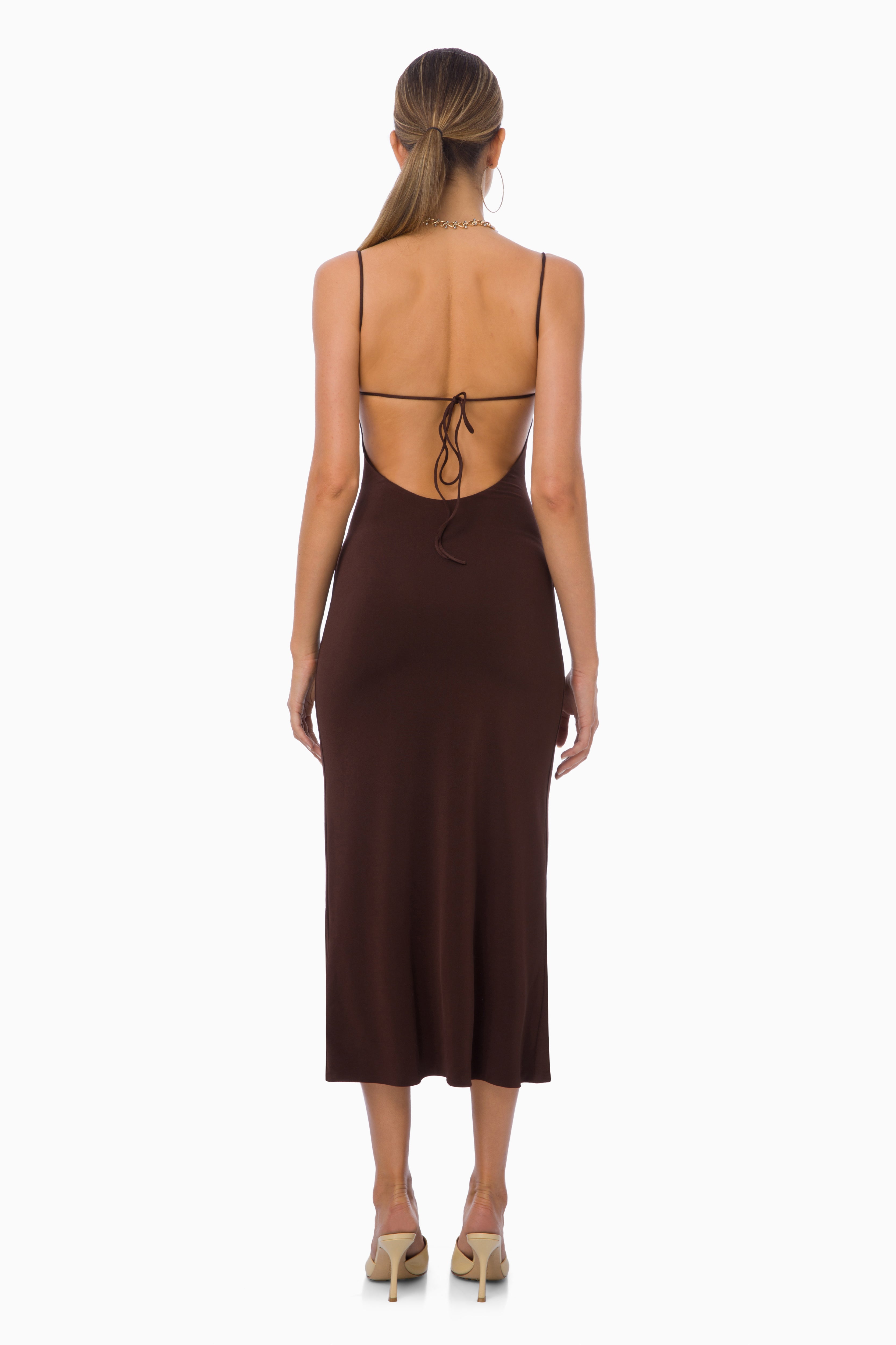 Hush Midi Dress embraces the body gracefully with its brown jersey fabric, creating a feminine silhouette. The open-back design and tie detail add a modern sense of allure. With its slim fit and simple structure, it transitions effortlessly from day to night. Mi Magic Love — feel the natural warmth of sophistication.