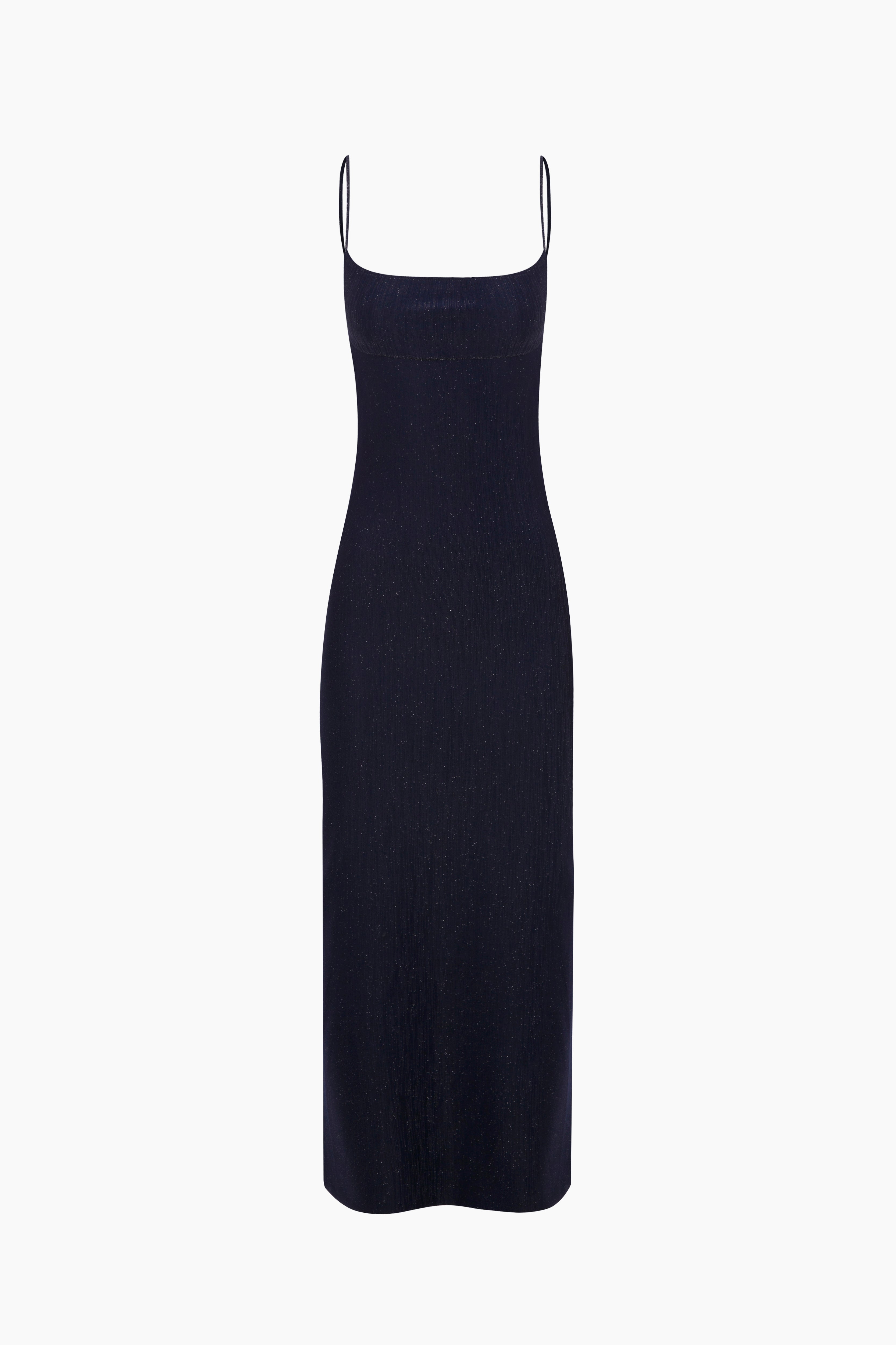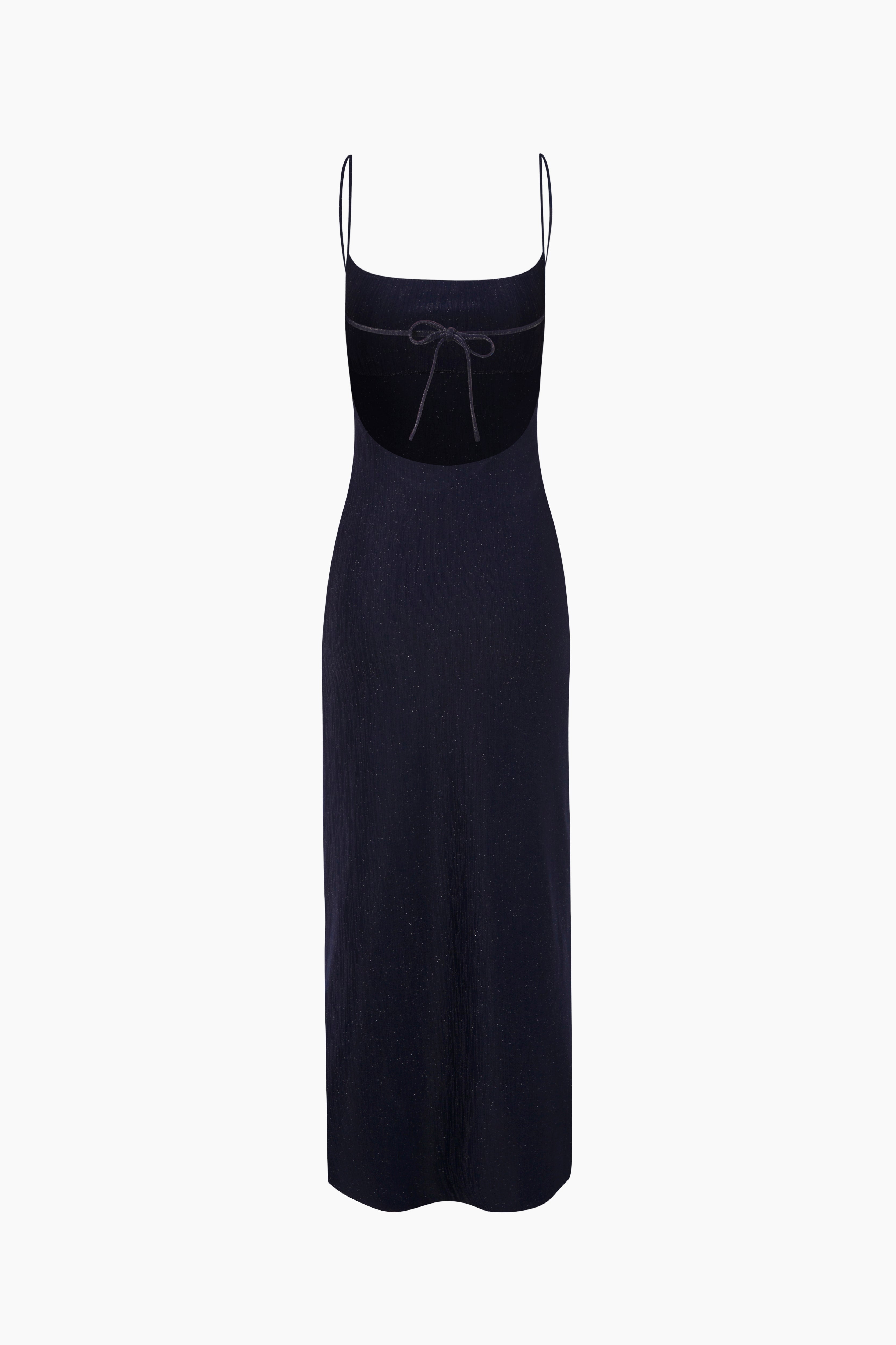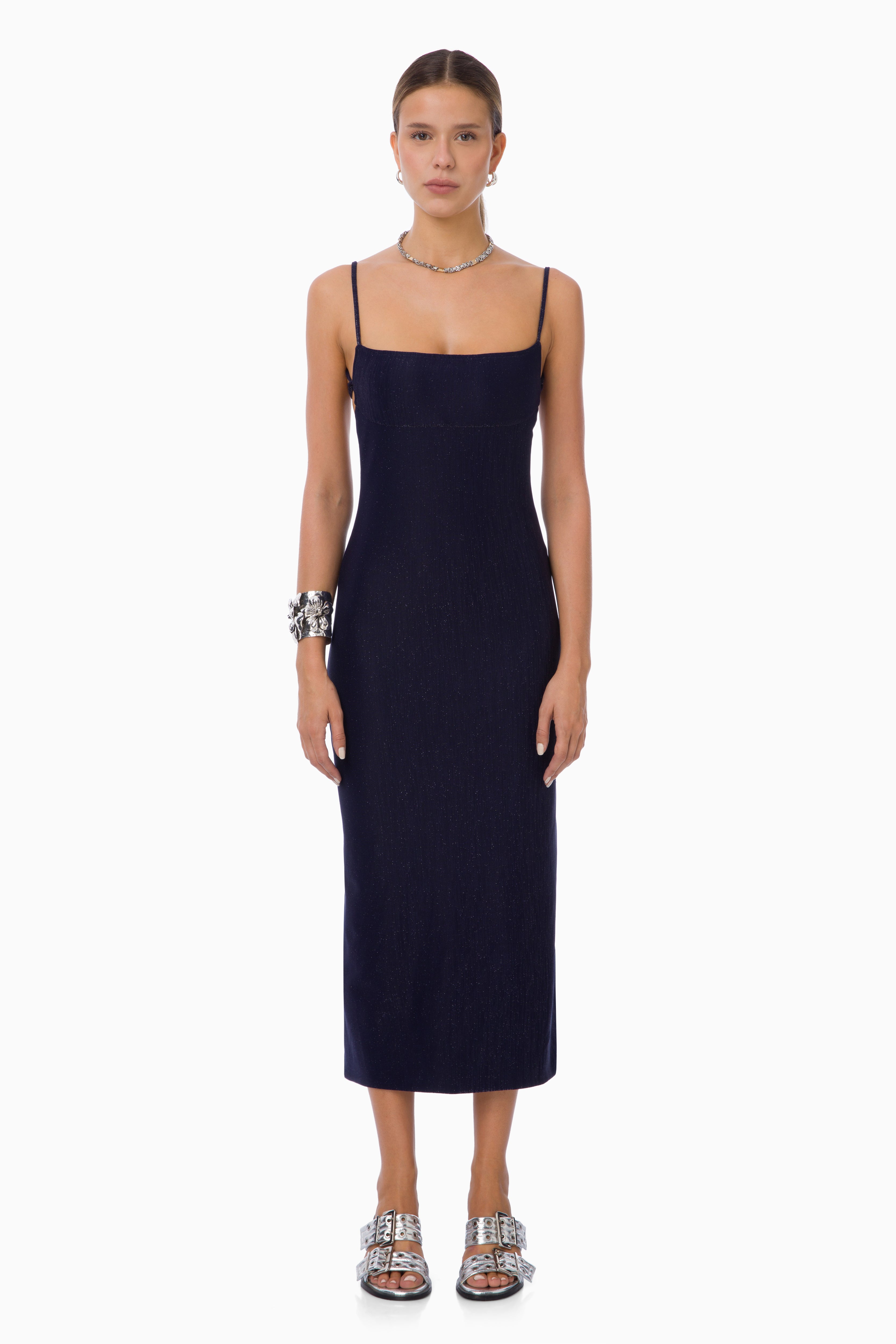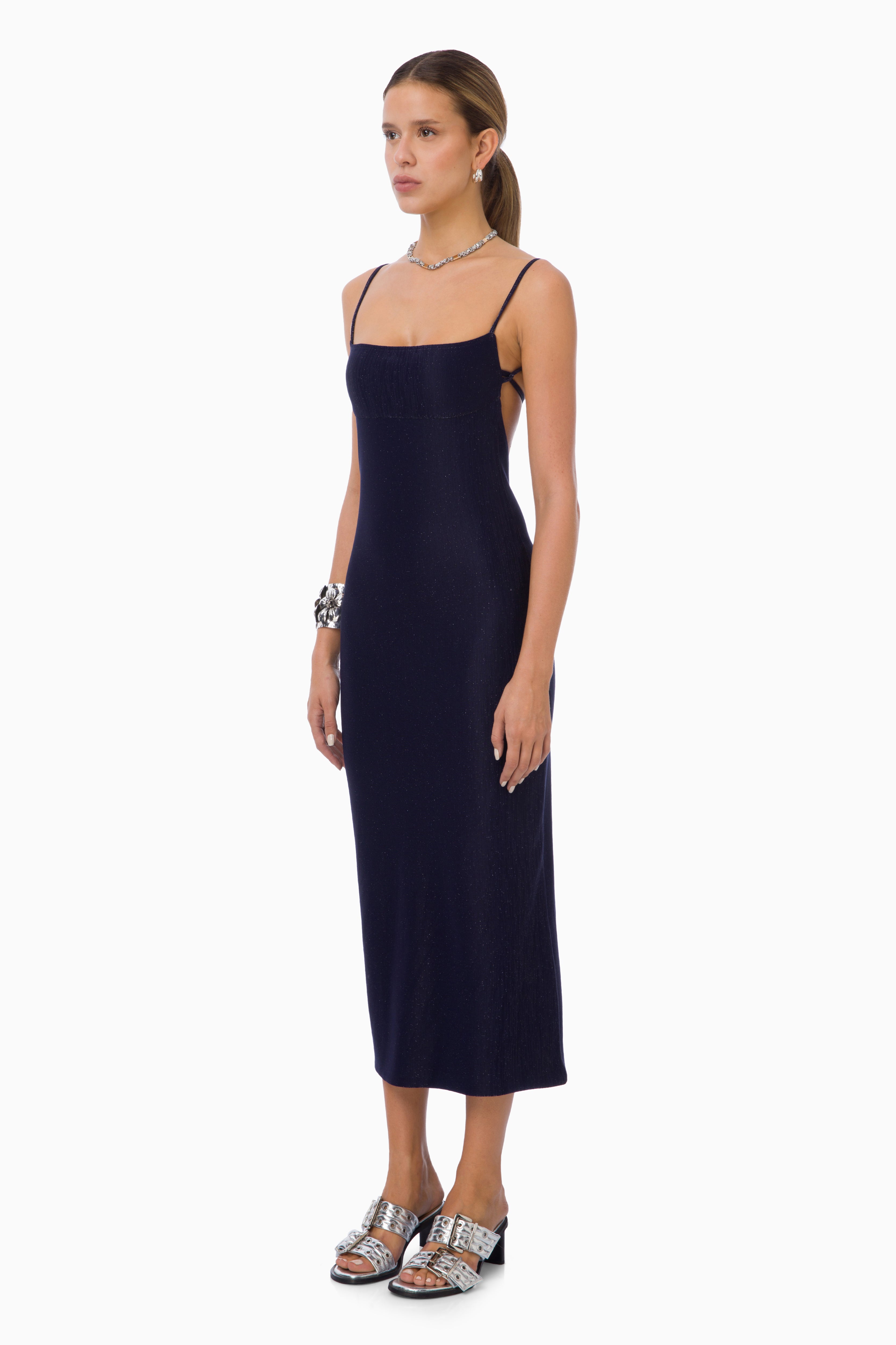 Hush Midi Dress reflects the brilliance of night elegance with its navy glittered jersey fabric. The fitted cut highlights the figure, while the open back and tie details bring a modern edge. Its subtly shimmering texture creates a simple yet striking effect. Mi Magic Love — feel the glow of understated glamour.