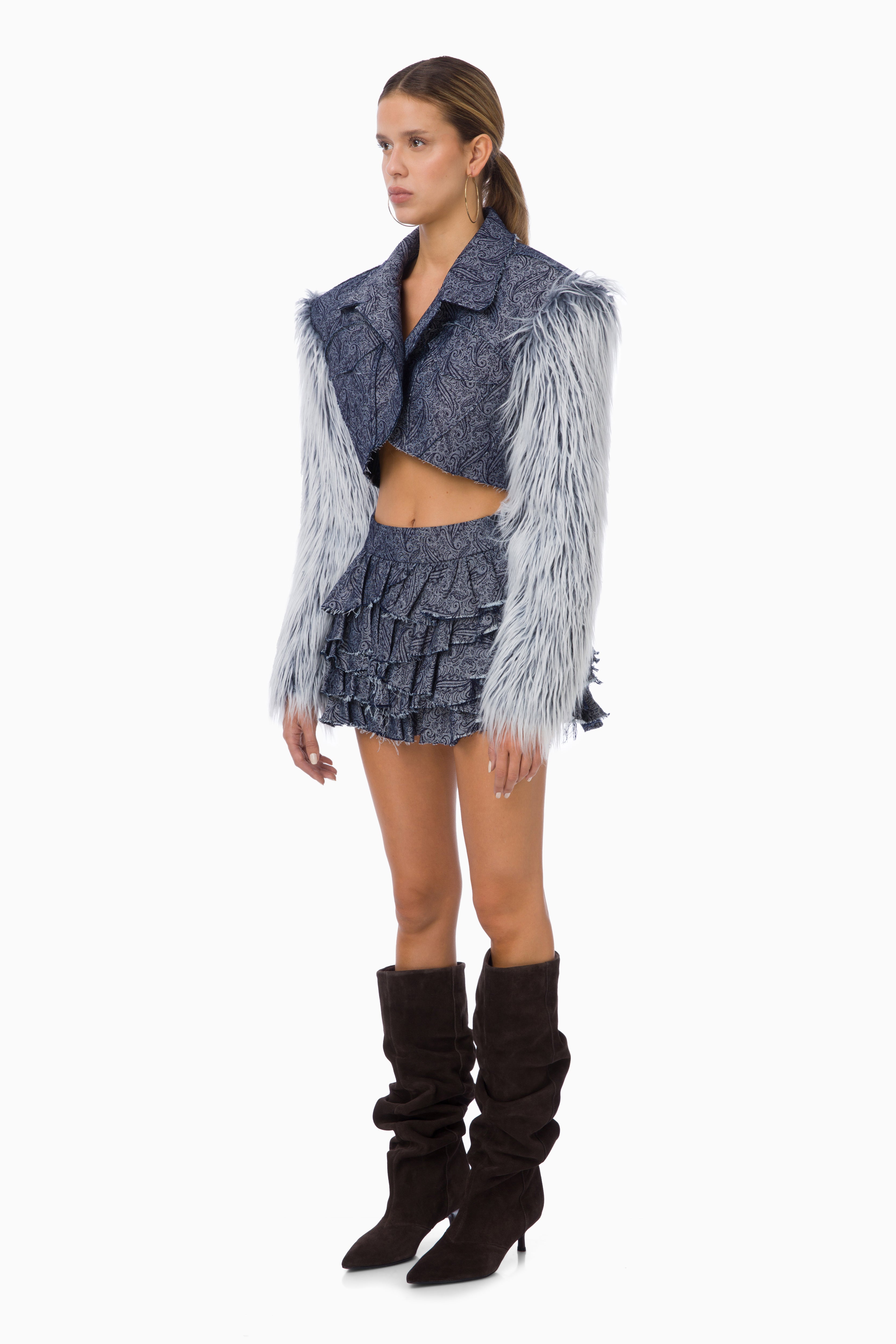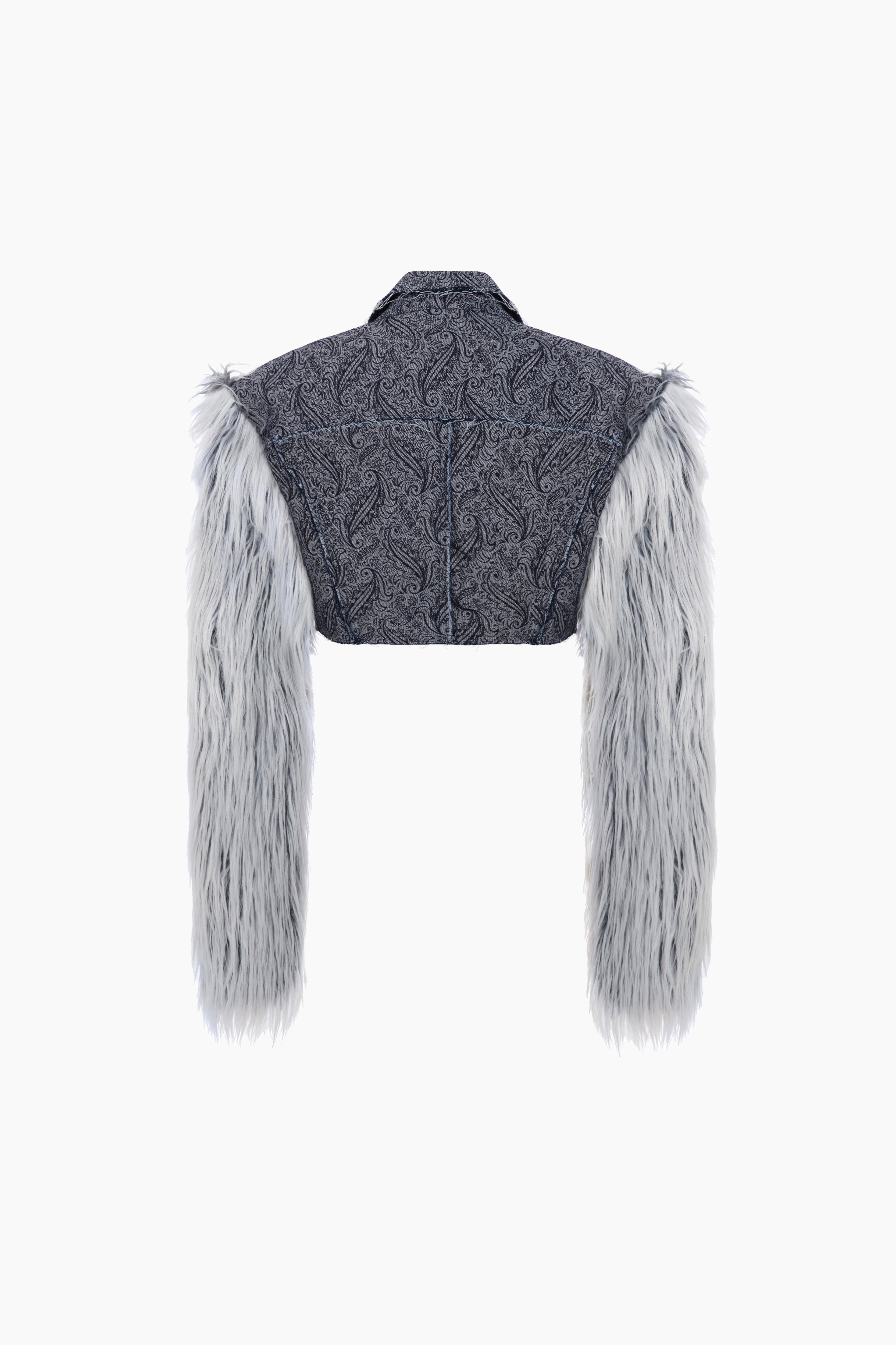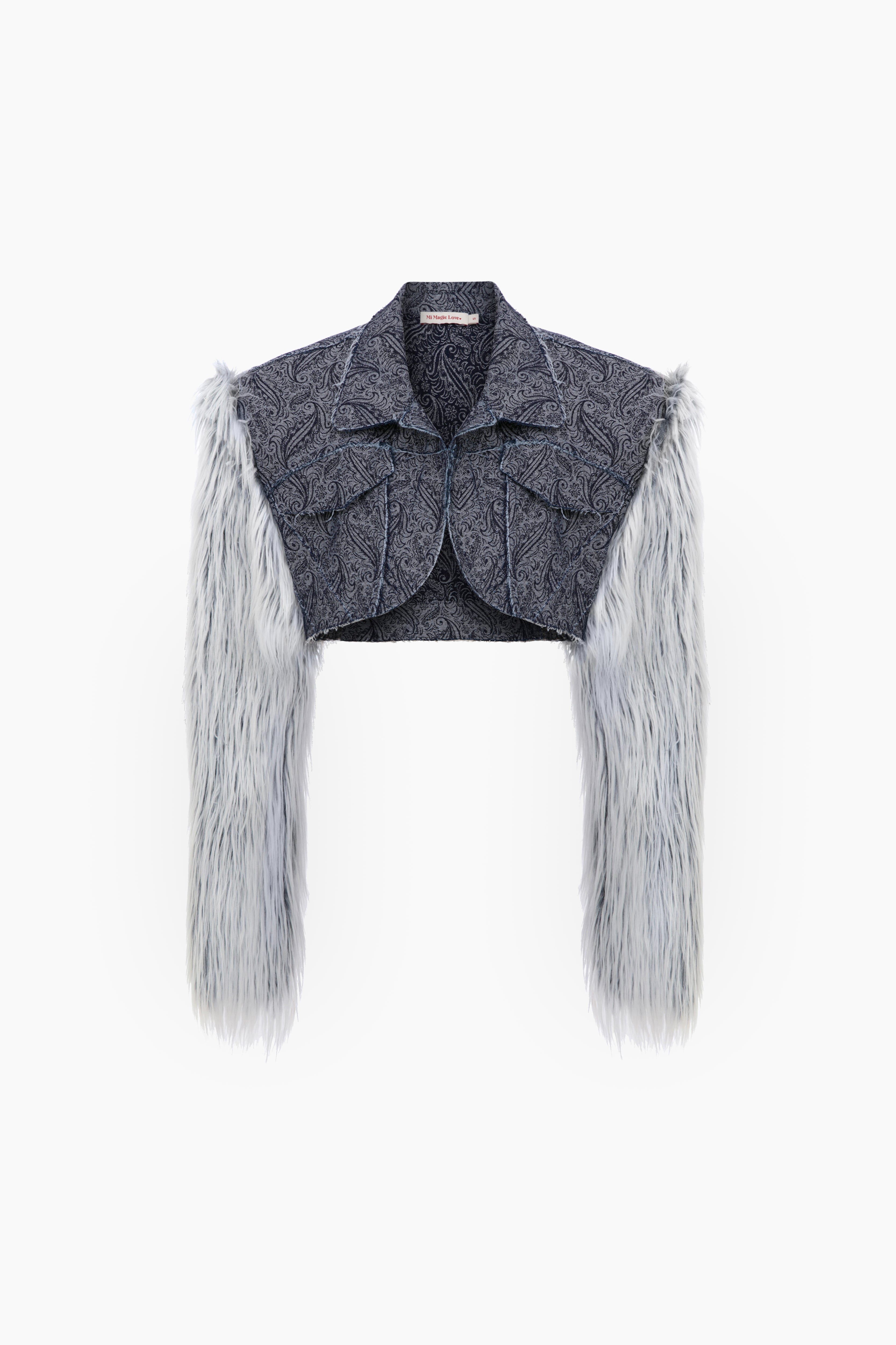 Blue Furry Denim Jacket / Dark Blue Patterned
