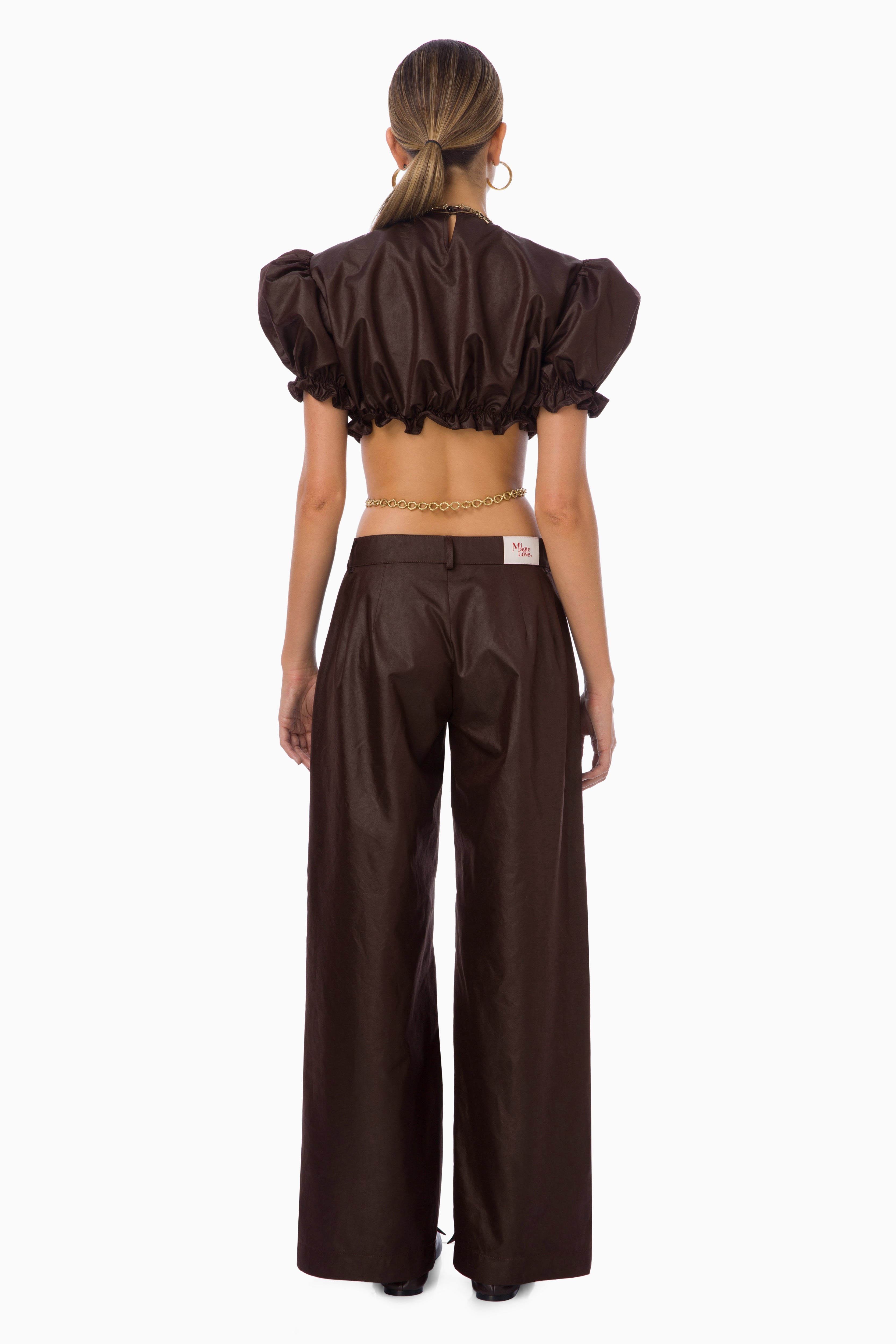 Mimi Crop Top stands out with its lightly glossy brown fabric, offering a modern and confident look. The short sleeves, puffed shoulders, and elasticated gathered waist create a feminine silhouette. With its leather-like texture, it becomes a bold essential for powerful styling. Mi Magic Love — let your strength take the spotlight.