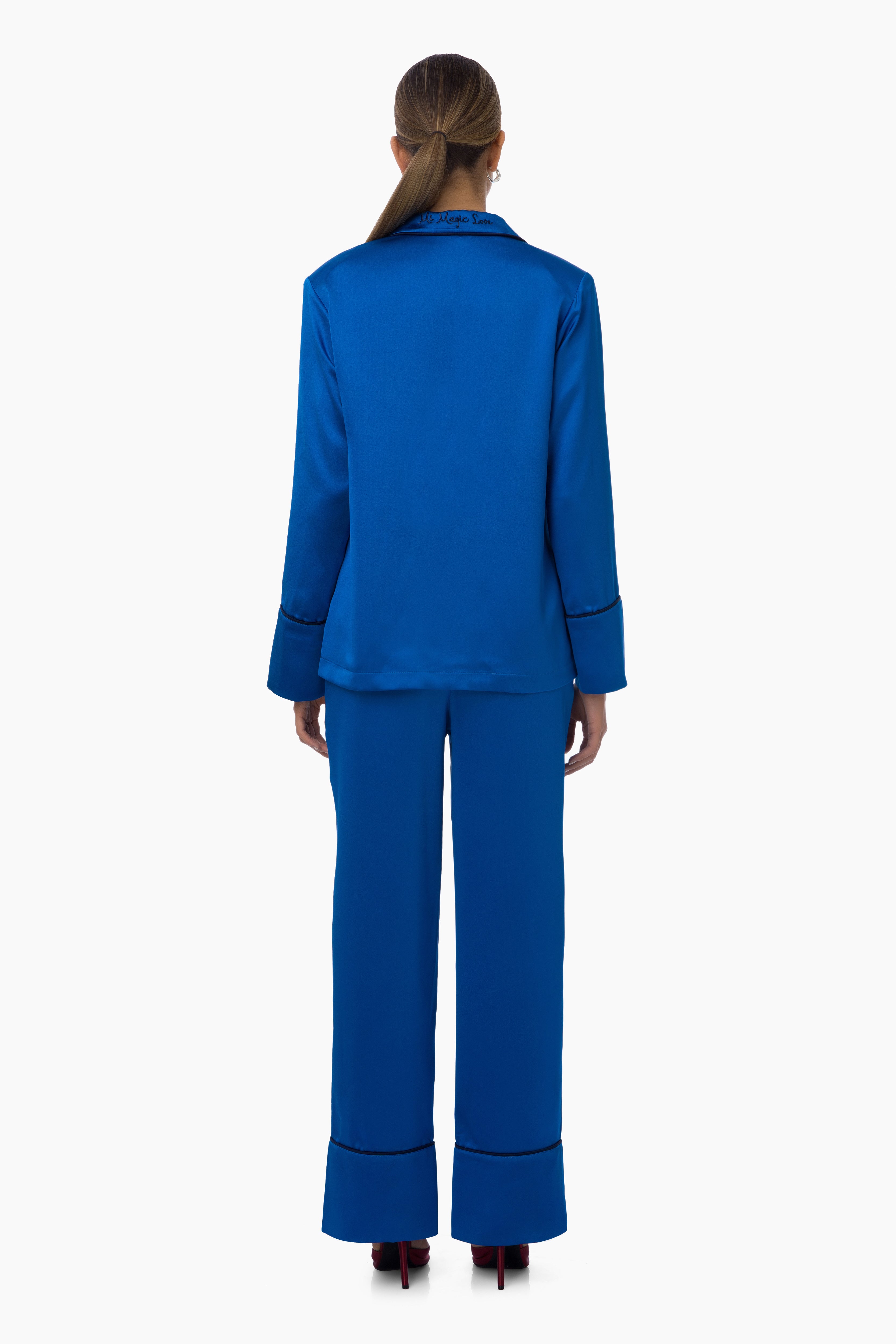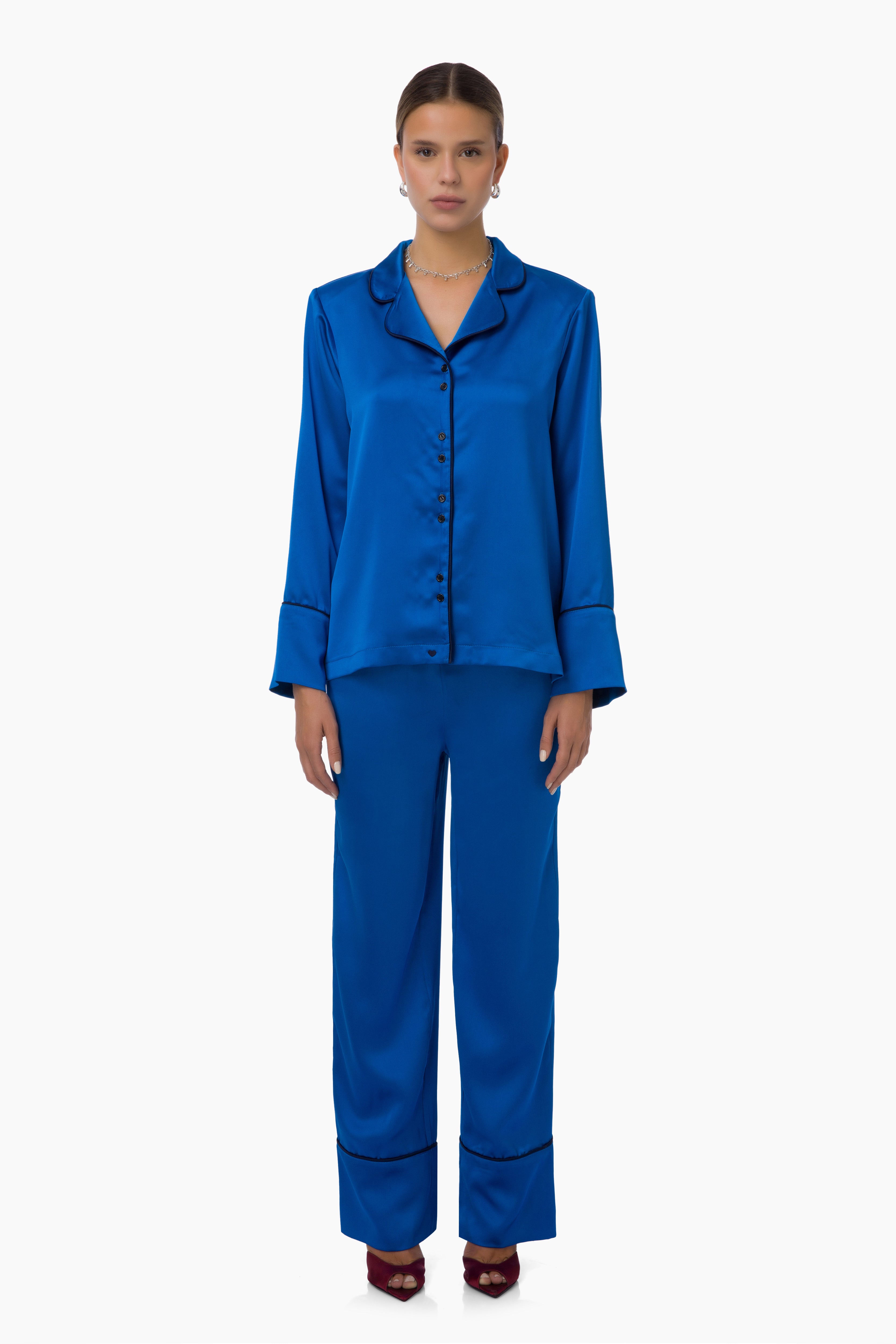 Satin shirt and trouser pyjama set combines comfort with a refined look through its soft texture. The contrast color design and embroidered collar detail bring a modern touch to a classic pyjama style. Standing out with the noble tone of royal blue, the Mio Set offers both comfort and aesthetic appeal at home. Mi Magic Love — feel your style in every moment.