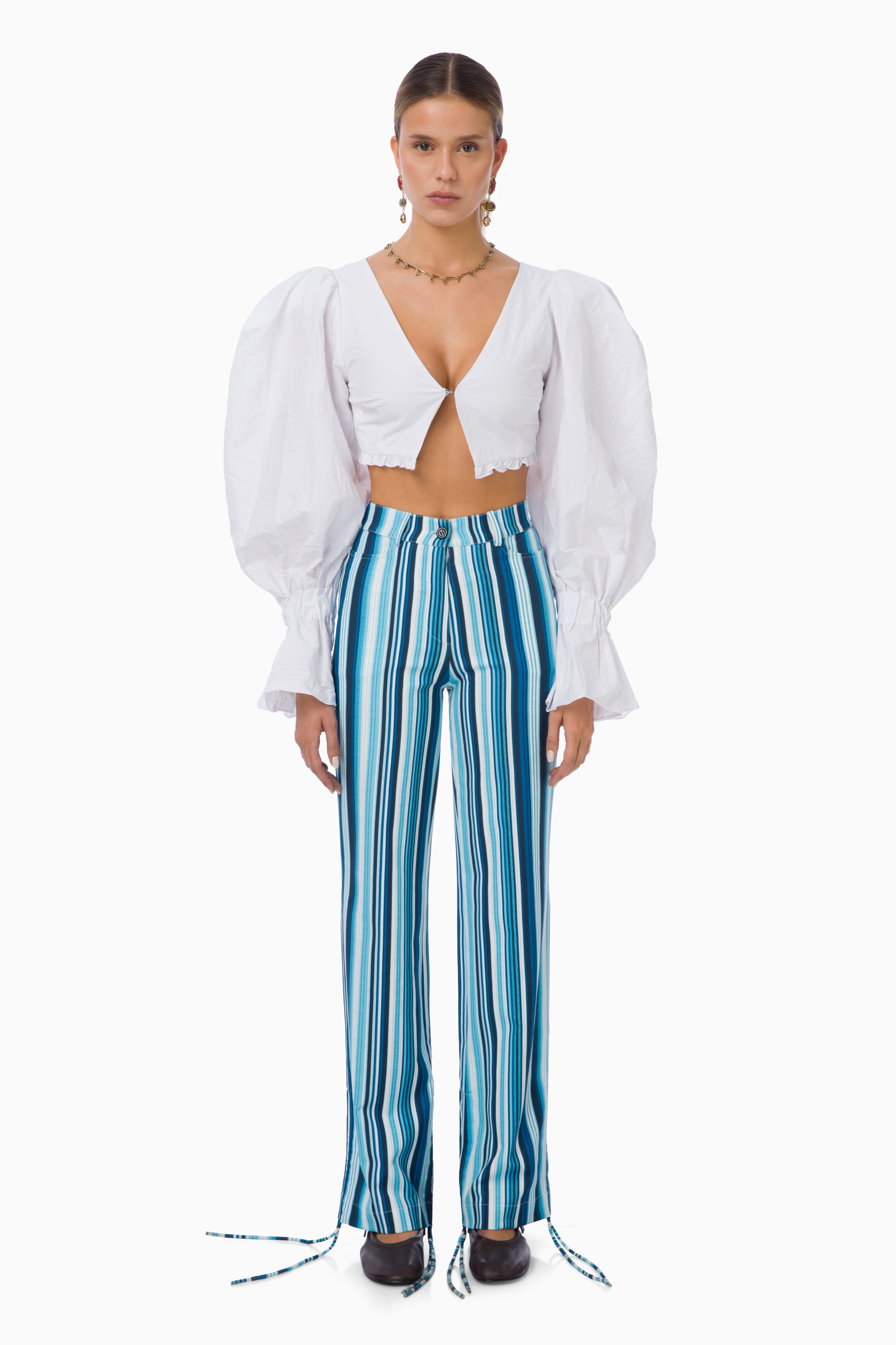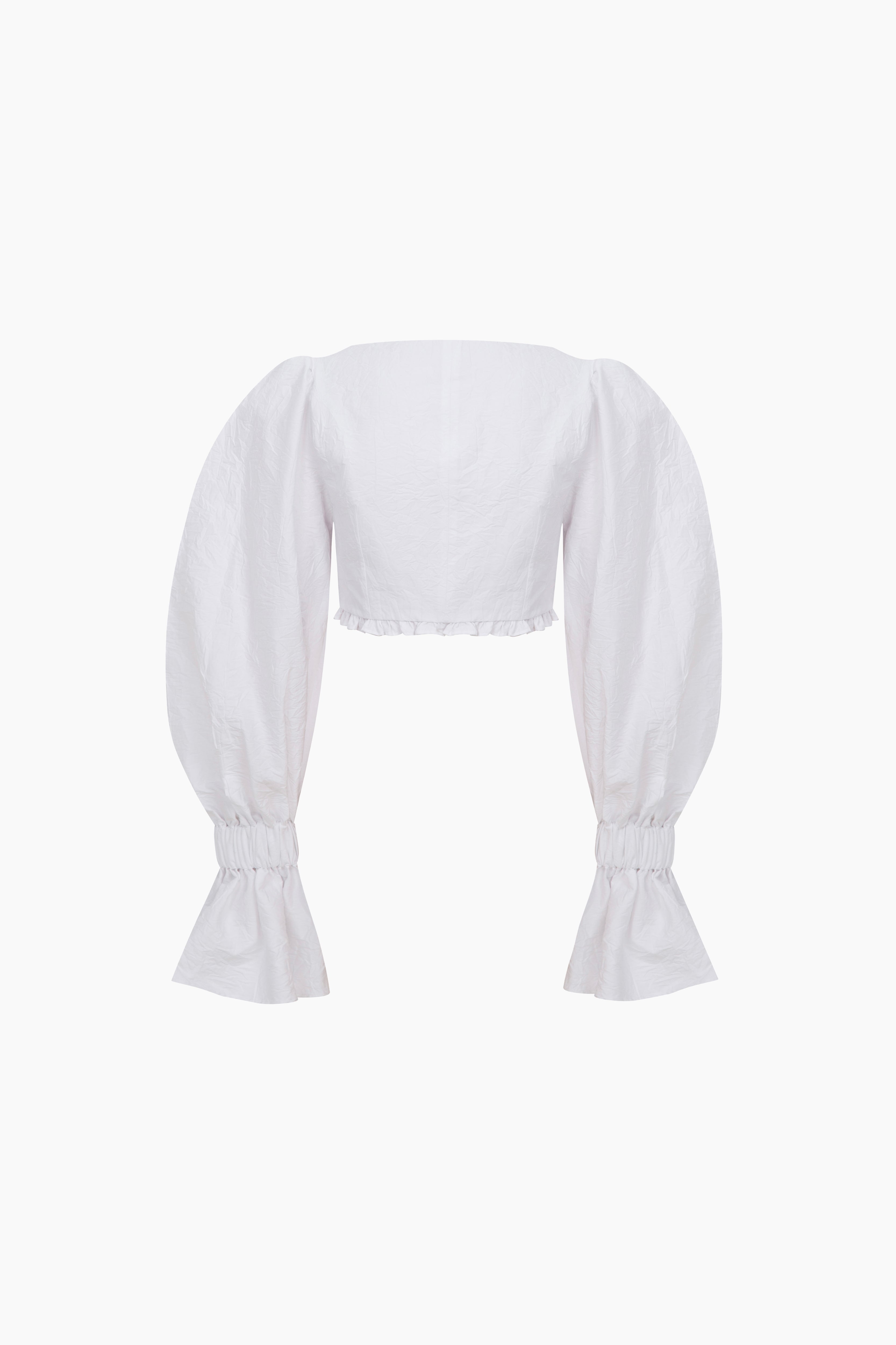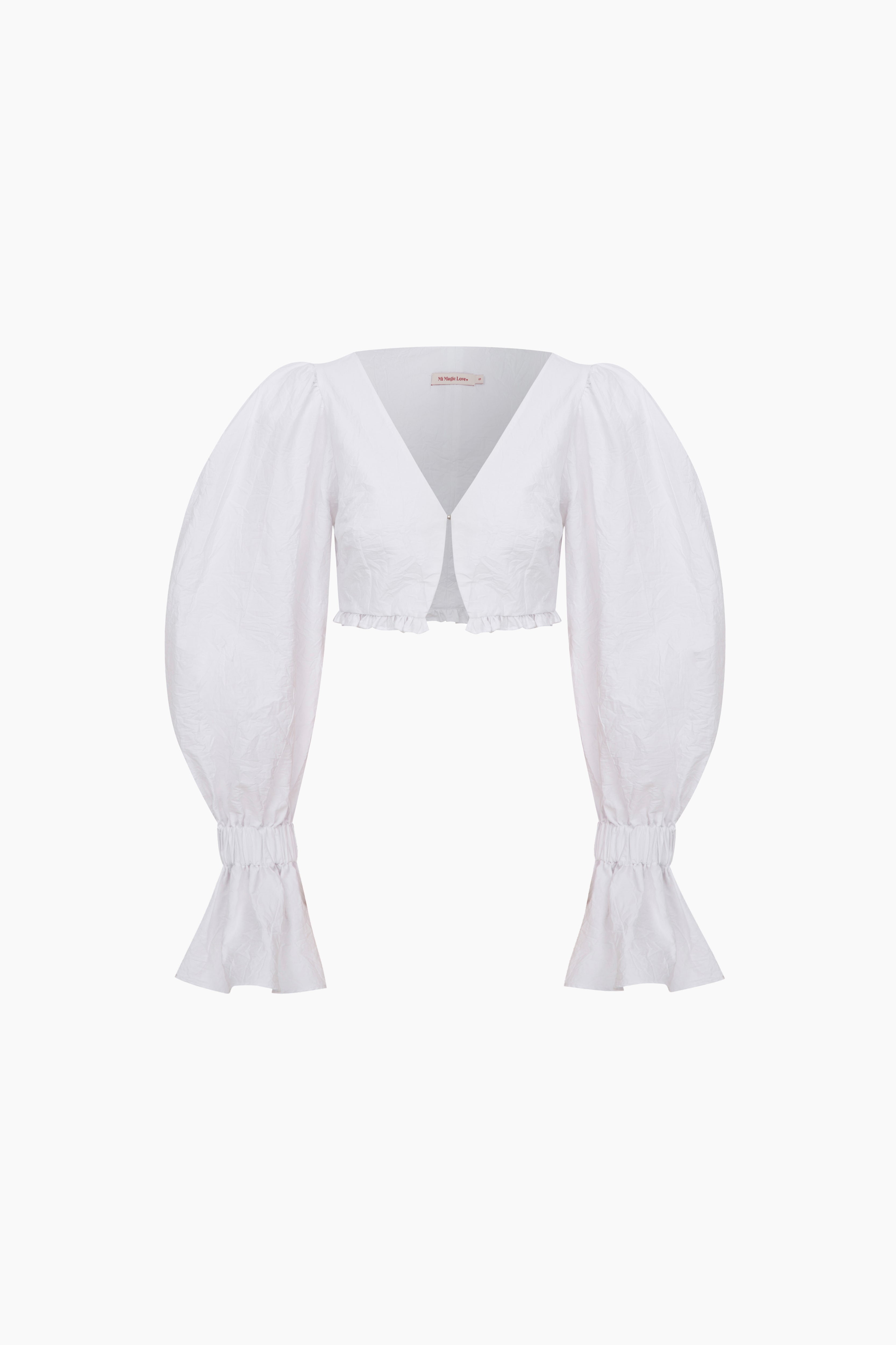 Sky Balloon Sleeve Shirt offers timeless refinement in white. The V-neckline and front closure form a feminine structure, while the balloon sleeves bring a modern sense of volume. The cropped cut pairs seamlessly with high-waisted trousers and skirts. Mi Magic Love — rediscover the purity of white style.