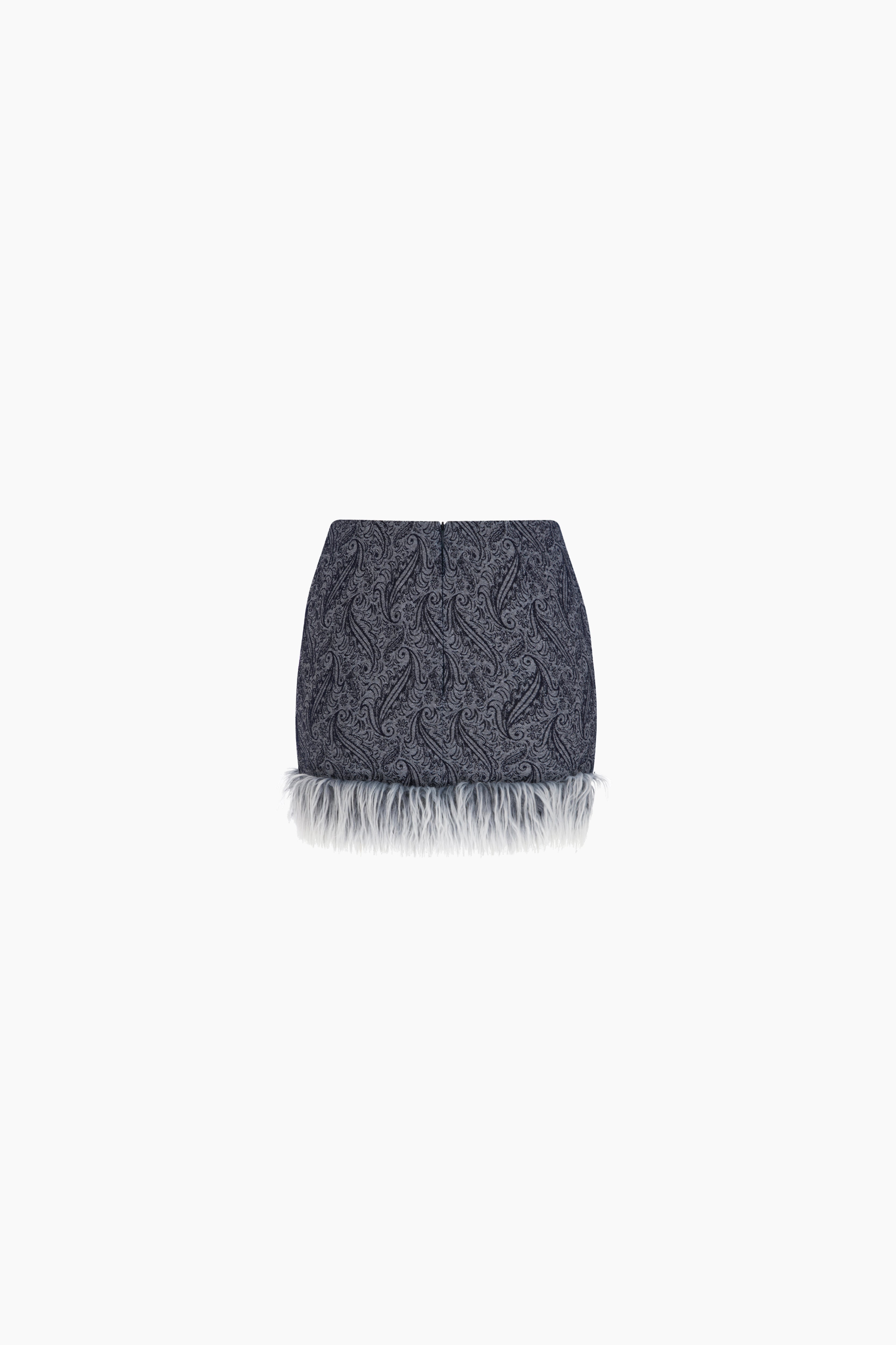 Milena Furry Mini Skirt offers an energetic and eye-catching style with its dark blue patterned denim fabric. The mid-rise waist and slim fit highlight the body’s form, while the icy blue fur trim adds a playful contrast. A bold and original piece that stands out in any look. Mi Magic Love — embrace the beauty of being different.