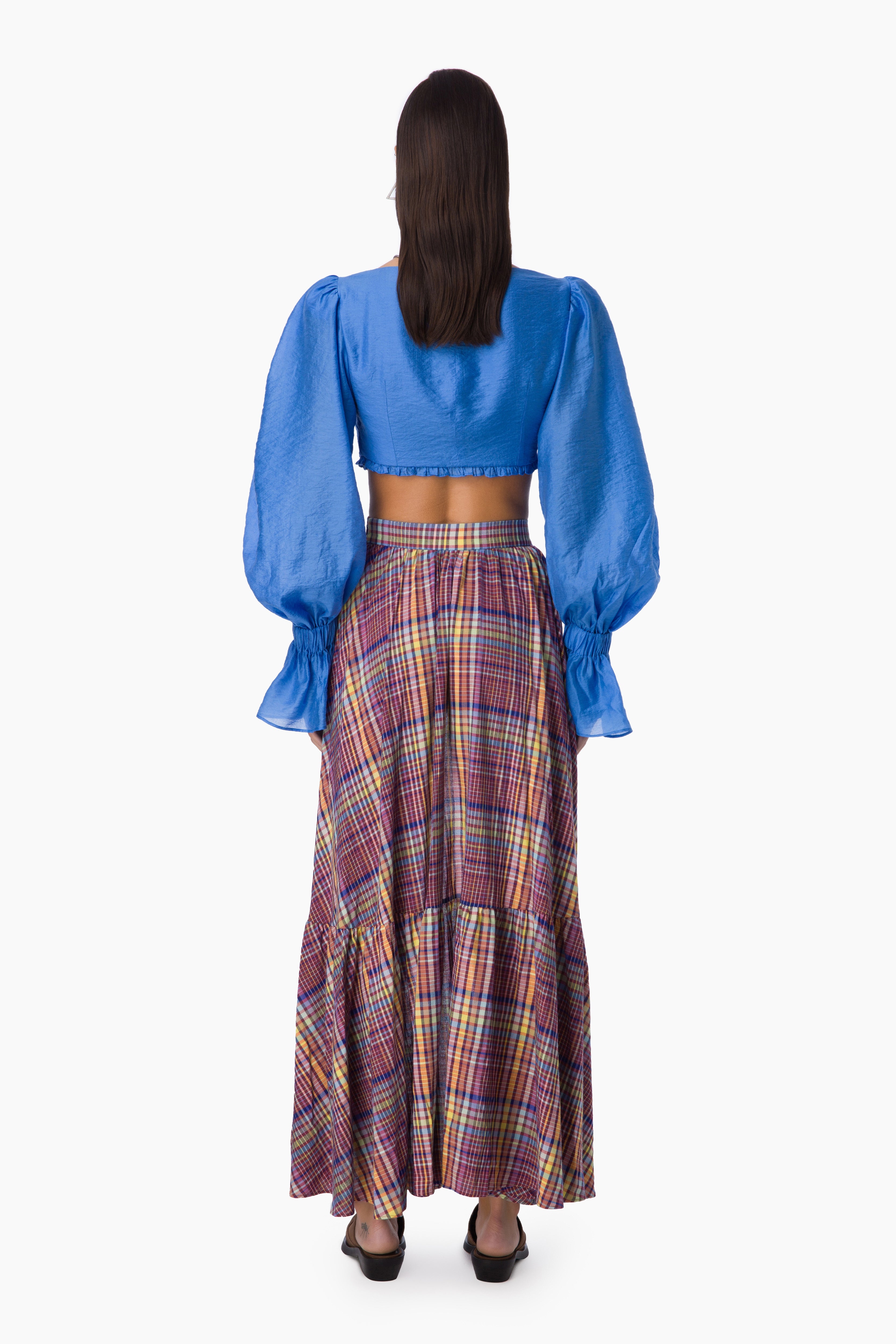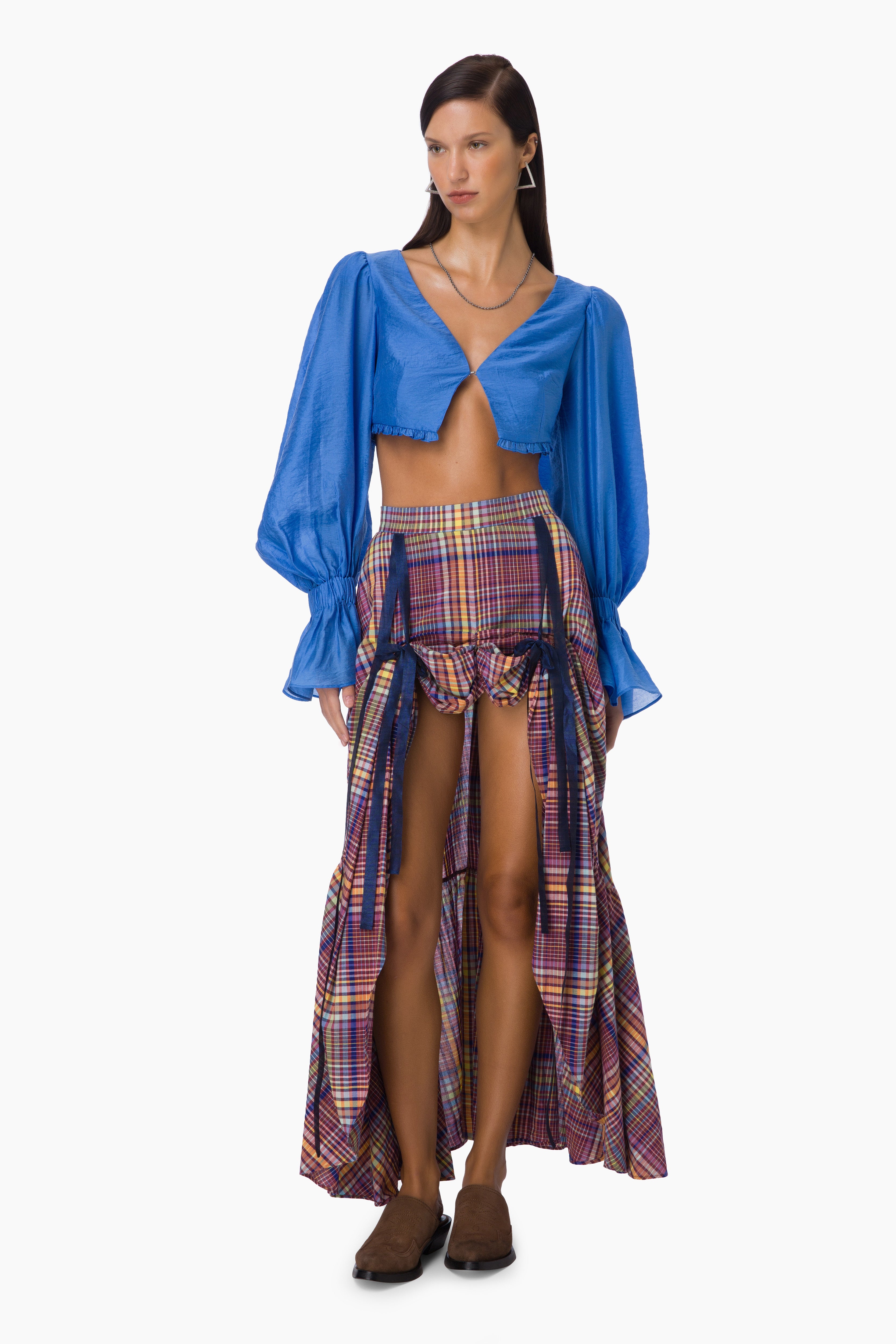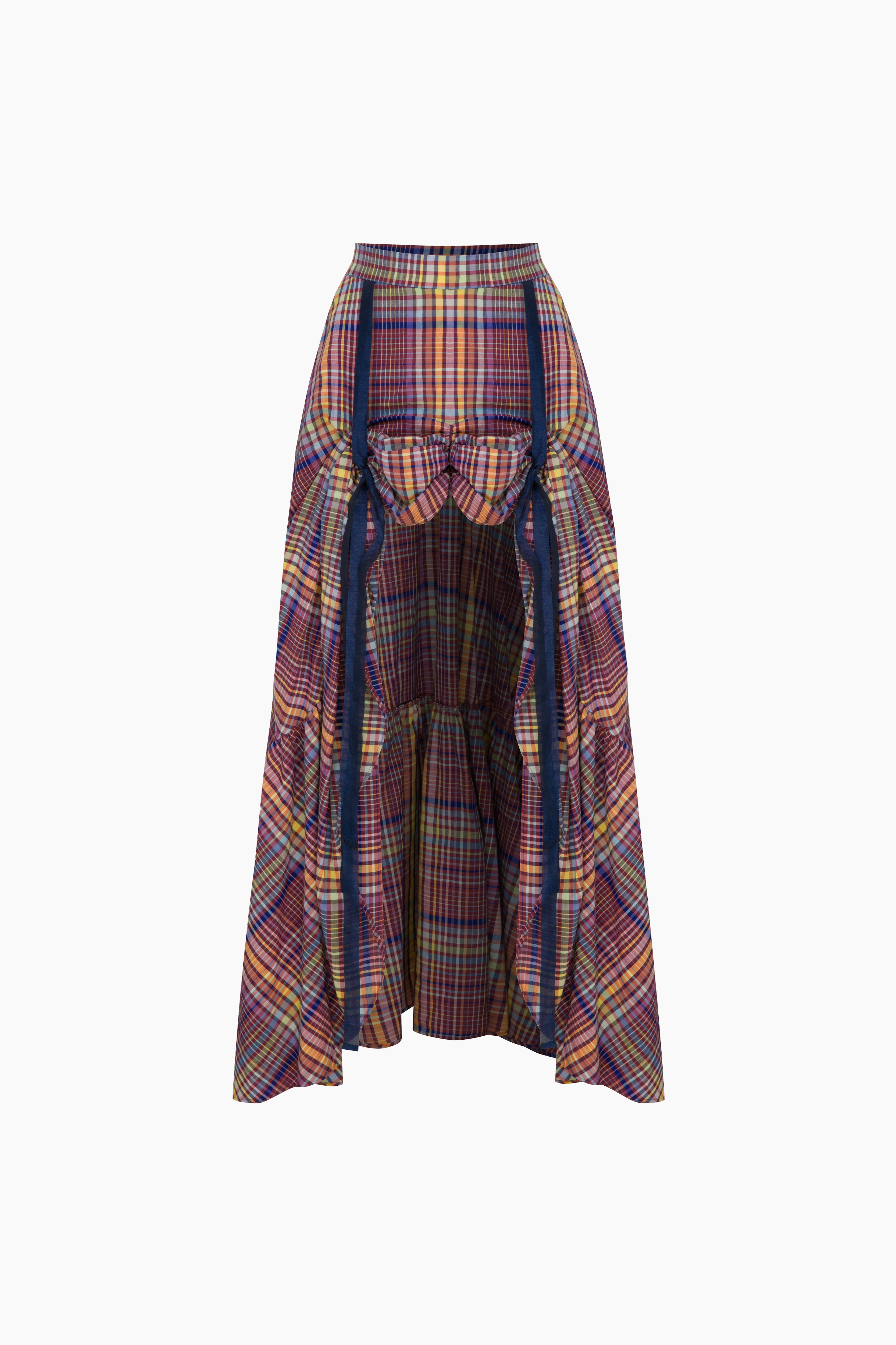 Time for adventures... The 'Rove' Assymetrical Skirt in Checked pattern and gatering & bow details on the front is desigend for those who are searching for more and more in the universe...